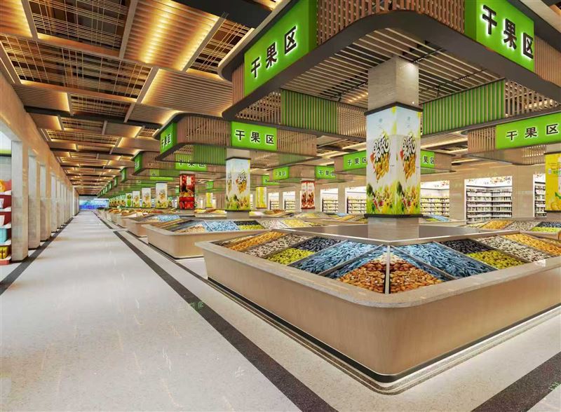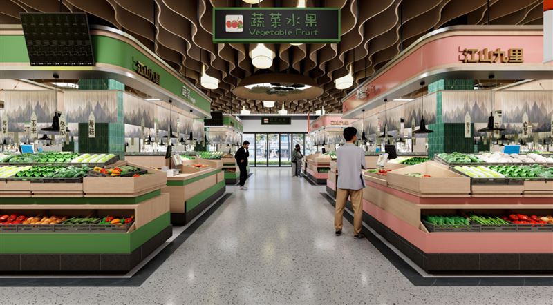 ⑦高端精装交付市场内部现代化设计,采用不同颜色划分区域,引导顾客购买细分品类;地面选用耐磨水磨石材质,吊顶采用木龙骨结构。市场格调提升似商场,顾客愿意多停留、多比较,成交机会直线上升,商铺生意自然红火。